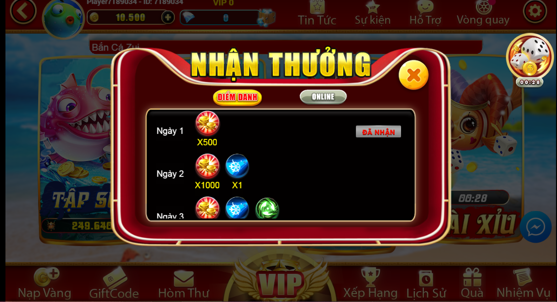 - Event diễn ra liên tục, tặng quà đã đời hàng ngày cho bạn tha hồ bắn cá mà không cần nạp tiền.