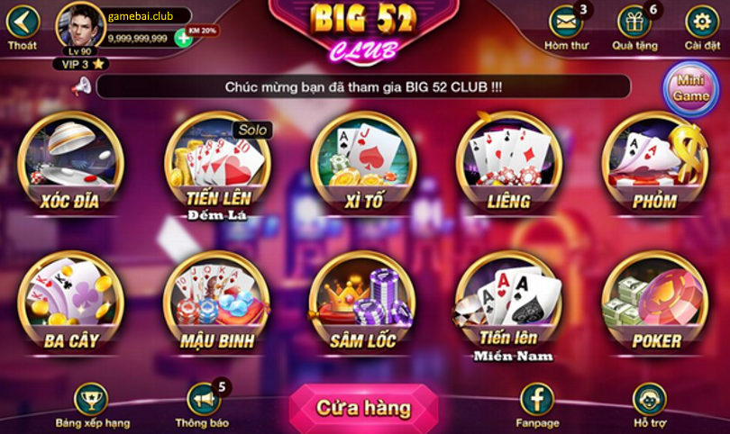 Cổng game bài Big52 club mang đến một kho ứng dụng game đổi thưởng đủ sức chinh phục tất cả mọi người. Dù cho đó có là khách hàng khó tính nhất. Tại đây, bạn sẽ được tha hồ giải trí với đủ các thể loại game ăn khách hiện nay như game đánh bài đổi thưởng, slot game đổi thưởng và mini game.